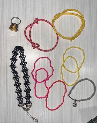 Conjunto de accesorios para los más pequeños, que incluye varias pulseras, un collar y un anillo. - Collar de encaje negro con detalles de flores. - Pulseras de cuentas en tonos rosa y rojo. - Pulseras de hilo amarillo. - Pulsera gris con charm de corona. - Anillo con piedra amarilla.