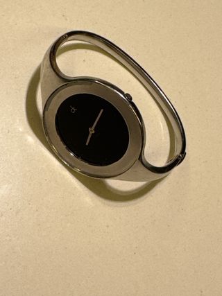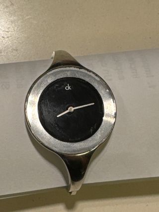 Elegante reloj de pulsera rígida de Calvin Klein. Le falta la esfera de cristal - Diseño moderno con esfera negra. - Brazalete de color plateado.