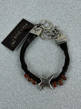 Pulsera de cuero con detalles de piedras y baño de plata. - Cierre de mosquetón. - Diseño con estrella. - Fabricado en España.