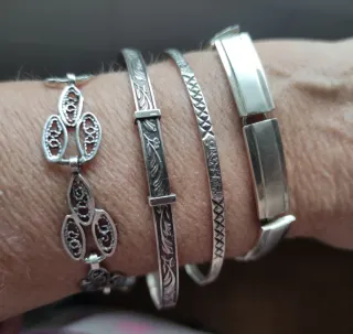 Pulsera ,aro plata de ley con grabados en relieve es ajustable 18 euros Pulsera piezas planas en brillo y mate articulada Con cierre de bastón 40 euros Pulsera plata de ley Filigrana Cordobesa muy antigua 25 euros Pulsera Aro fina con dibujos tribales 12 euros