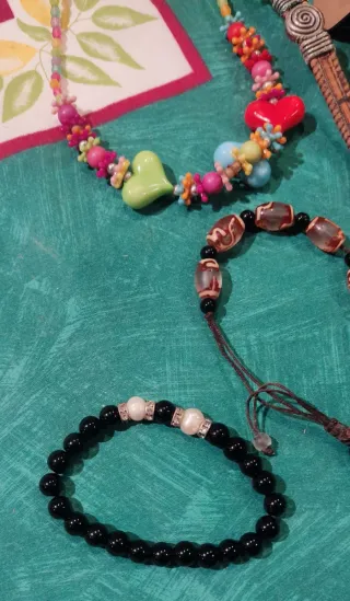 Collar de pidras negras y grises mide 53 cm con cierre de plata 30 euros Collar y pulsera de perlas rio cuero granate y plata de ley 20 euros Collar de malaquitas Con cierre chapado Mide 46 cm 16 euros