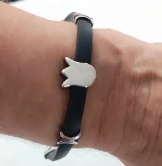 Pulsera plata de ley y negro con remates y cierre de plata 30 euros Pulsera de caucho con charms de plata y circonitas con cierre de seguridad 40 euros Pulsera Aro Con dibujos Es un aro macizo Con formas ovales 20 euros