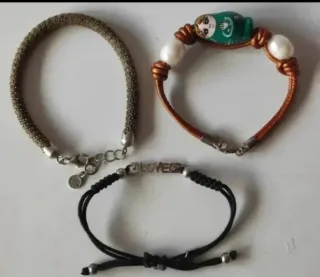 Pulsera plata de ley y perlas con plata 12 euros Pulsera plata de ley con cuero verde y colgante Lauburu de plata 15 euros Pulsera con bolas perla y plata de ley 13 euros sin marca