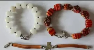 Pulsera de cristales de Murano de colores 12 euros Pulsera de piedras de Lava con distintos tamaños Los remates y el cierre de plata 16 euros Pulsera perlas de rio color entre rosa y beige con los remates y el cierre de plata 17 euros