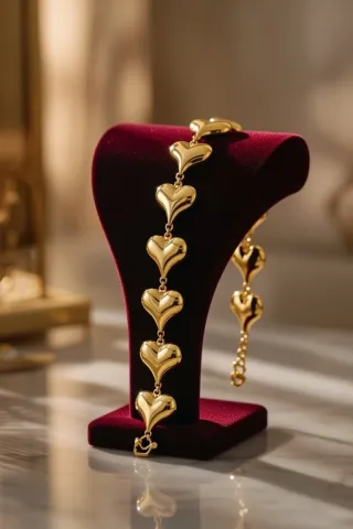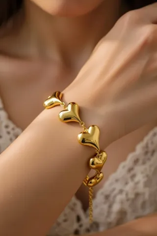 Elegante pulsera tipo brazalete con un diseño de corazones entrelazados. - Acabado en tono dorado. - Diseño abierto y ajustable. - Estilo delicado y romántico. - Fabricado en acero quirúrgico - Resistente al agua y al deslustre - Hipoalergénico - Totalmente nuevo sin usar