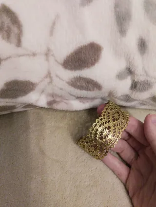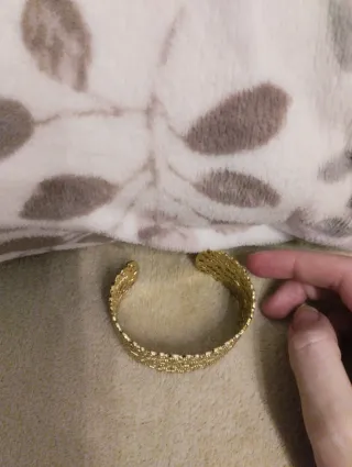 No es de oro macizo, sí está bañada en oro real. La vendo porque yo tengo el brazo muy muy fino y se me cae, la compré en un mercado de artesanía y no me dejan devolverla.