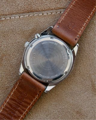 Elegante reloj de pulsera con correa de cuero marrón y detalles en tono dorado. - Esfera blanca con indicadores y subesferas. - Correa de cuero con textura. - Bisel con números y marcas. No tiene pila, resistente al agua34TM Micron 23K gold plated