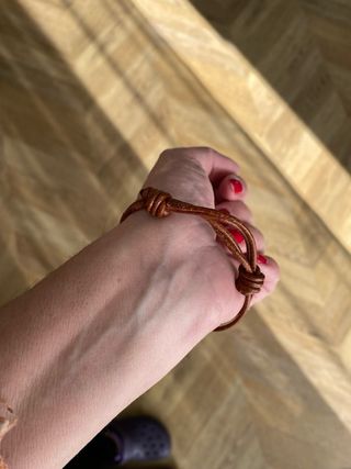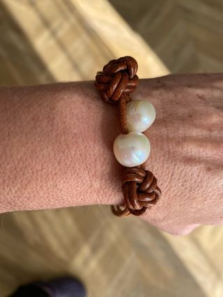 Pulsera artesanal con detalles de cuero y perlas. - Diseño con nudos de cuero. - Dos perlas blancas integradas.