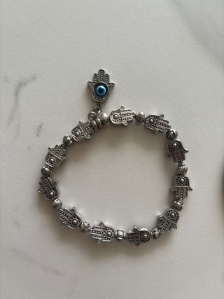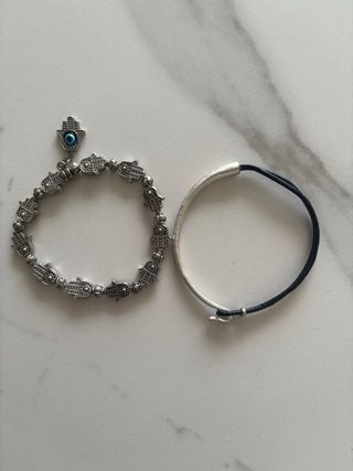 Conjunto de dos pulseras. - Una pulsera con motivos de manos de Fátima y un ojo turco. - Otra pulsera con cordón negro y detalle metálico curvo.