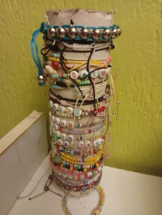 Conjunto de pulseras. - Pulsera de cuerda con nudos y detalles verdes. - Pulsera tejida con diseño de rombos en tonos verdes. - De perlas - Pulsera mano de Fátima - Cruz rosa - Pulsera de piedras 1€ la unidad. Negociable por la compra de varias. Precio mínimo de envío 10€. Más en mi perfil.