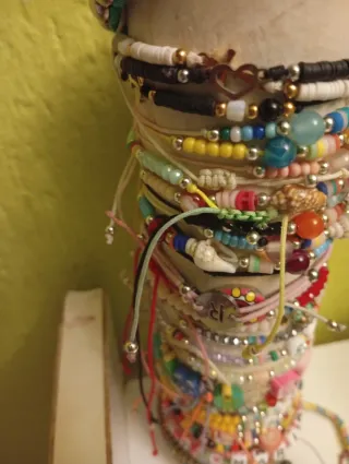 Conjunto de pulseras de mujer con una variedad de diseños y cuentas. - Diseños variados con cuentas de colores. - Cuentas metálicas plateadas. - Cuerdas de ajuste.