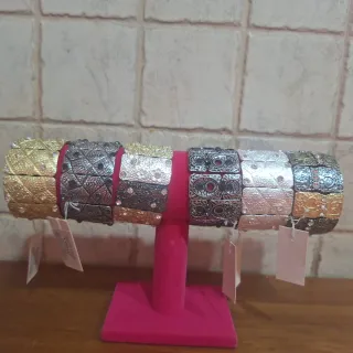 Conjunto de pulseras tipo brazalete con un diseño elaborado. - Acabado en tonos dorados y plateados. - Detalles texturizados y con incrustaciones. - Diseño elástico para mayor comodidad. Hay 25 unidades Es todo de una tienda La marca no corresponde al producto