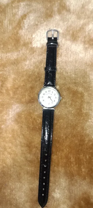 Elegante reloj de pulsera con correa de piel negra. - Esfera redonda plateada. - Correa de piel sintética con acabado brillante. - Cierre de hebilla plateada.