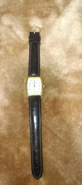 Elegante reloj de pulsera con correa. - Diseño rectangular. - Correa de piel con acabado. - Detalles dorados en la caja.