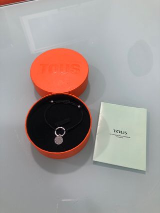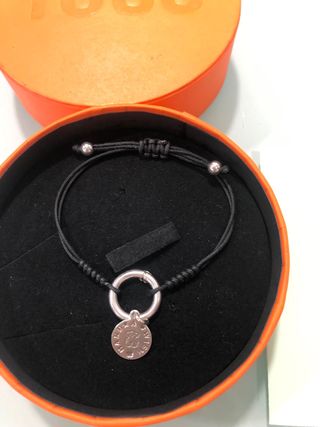 Pulsera de la marca Tous con un diseño elegante. - Cuerda negra ajustable. - Aro plateado. - Medalla redonda con el icónico oso de Tous. - Inscripción MAKE A WISH en la medalla.