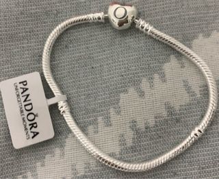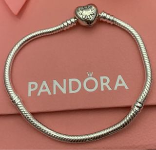 Elegante pulsera de la marca Pandora con un charm en forma de corazón. Un accesorio clásico y versátil. - Sin caja talla 18 cm - Diseño de cadena tipo serpiente. - Cierre seguro. - Acabado plateado brillante.
