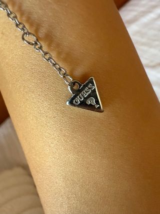 Preciosa pulsera Guess de acero inoxidable. Es una pieza elegante y discreta, ideal para el uso diario. - Cadena fina y resistente. - Diseño minimalista con el logo de la marca grabado en un dije triangular.