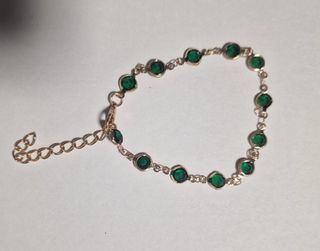 Elegante pulsera de cadena dorada en aleación de zinc con tres brillantes circonitas de color verde. Diseño delicado y femenino. Ideal para cualquier ocasión. Perfecta para un regalo.