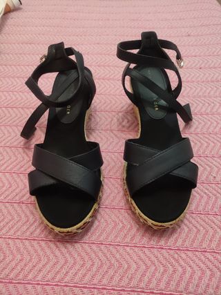 Sandalias de cuña de la marca Tommy Hilfiger en color azul marino .Perfectas para un look casual y elegante. - Diseño de tiras cruzadas en la pala. - Cierre de pulsera al tobillo con hebilla. - Plataforma forrada de esparto. - Tacón de cuña.