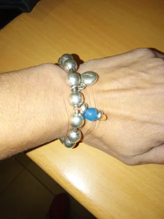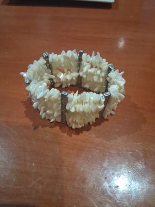 Preciosa pulsera de piedras blancas y detalles en plata. Es una pulsera elegante y delicada, ideal para cualquier ocasión. - Está compuesta por pequeñas piedras blancas, posiblemente de imitación de coral. - Los detalles plateados le dan un toque sofisticado. - Es una pulsera elástica, por lo que se adapta fácilmente a la muñeca.