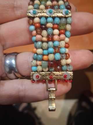 Preciosa pulsera de cuentas, ideal para añadir un toque de color a tu look. Es una pieza única y llamativa. - Elaborada con cuentas de diversos colores. - Adornos dorados que le dan un toque elegante. - Diseño llamativo y vistoso.