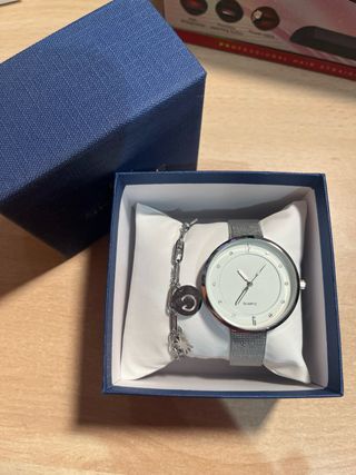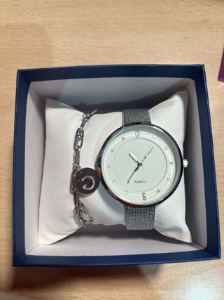 Elegante conjunto de reloj y pulsera. - Esfera blanca. - Pulsera de malla plateada. - Incluye pulsera con dijes.