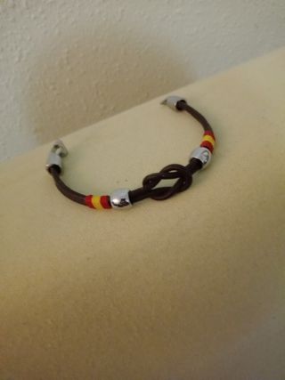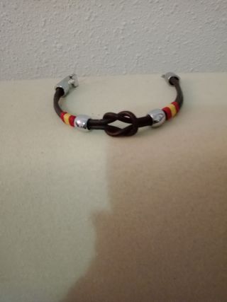 Preciosa pulsera de cuero con los colores de la bandera de España. Es una pieza elegante y discreta, ideal para el día a día. - Elaborada con cuero. - Cierre de metal. - Adorno con diseño floral.
