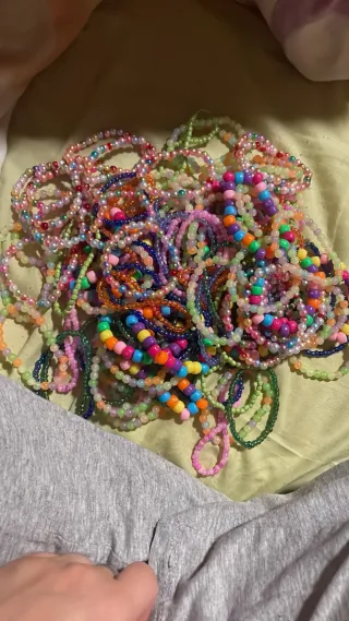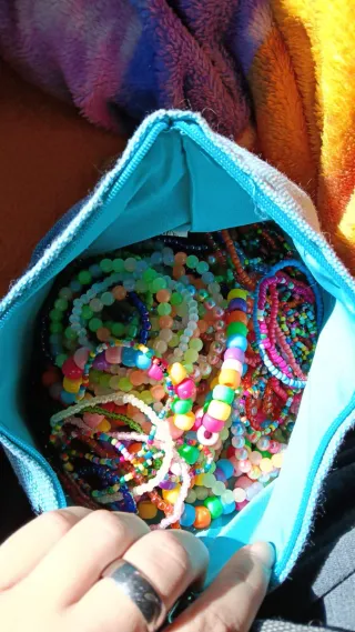 Lote de 10 pulseras de cuentas estilo Kandi, perfectas para festivales o como accesorio. - Diseños variados y alegres. - Hechas con cuentas de plástico. - Ideales para intercambiar.