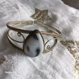 Elegante pulsera con un dije central de piedra blanca y vetas negras. El diseño es abierto y ajustable. - Dije con forma de lágrima. - Detalles calados en la estructura.