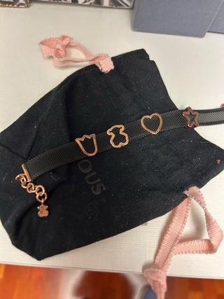 Elegante pulsera de la marca Tous con malla negra y detalles en dorado. Perfecta para añadir un toque de estilo. - Diseño con charms de corazón, oso, estrella y flor. - Malla de acero inoxidable. - Cierre ajustable. - 17 cm, poco usada