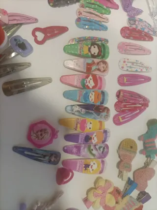 Lote variado de accesorios para el cabello y bisutería. - Horquillas de diferentes tamaños y diseños. Hay un lote de pinzas de princesas muy bonitas, Frozen, Blancanieves, Cenicienta, Rapunzel, - Gomas para el pelo con muñecas - Pulseras de cuentas muy coloridas. - Abalorios sueltos para manualidades y muchos de ellos expuestos en hilos flexibles para poder usarlos. Todo en muy buen estado.