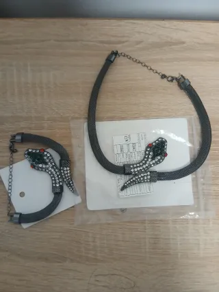 Conjunto de collar y pulsera con diseño de serpiente. - Diseño detallado de serpiente con incrustaciones. - Cadena de malla metálica. - Cierre de mosquetón.
