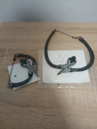 Elegante conjunto de collar y pulsera con diseño de serpiente. - Diseño llamativo con detalles de pedrería. - Acabado en tono dorado. - Incluye collar y pulsera a juego.