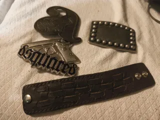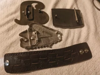 Conjunto de hebillas para cinturón y una pulsera de cuero. - Hebilla con diseño de pistola y texto. - Hebilla con borde de tachuelas. - Hebilla con diseño de figura. - Pulsera de cuero tejida.