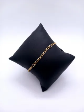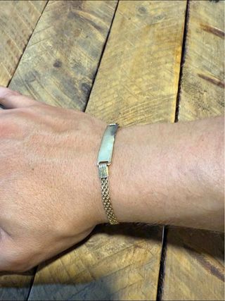 Referencia: 05-00006 Descripción: Pulsera barbada de 21cm con cierre de mosquetón Estado: De ocasión Peso: 3.94g Contraste: Sí Kilate: 18K Detalles joya: Ninguno Grabaciones: No Fecha de envío: Inmediata Estamos en Gran Vía 50 Bajo, 26005 Logroño. Somos un comercio de color azul que hace esquina en la fuente de los Riojanos Ilustres. Cerca de paradas de autobús, líneas 2, 3, 4, 6, 7 y 10. Nuestro horario es de lunes a viernes de 09:00 a 21:00 y sábados de 9:00 a 15:00 en horario continuo.