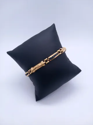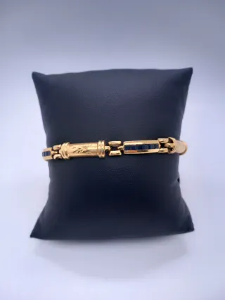 Referencia: 05-00005 Descripción: Pulsera de 19cm con pedrería y cierre de mosquetón Estado: De ocasión Peso: 14.48g Contraste: Sí Kilate: 18K Detalles joya: Ninguno Grabaciones: No Fecha de envío: Inmediata Estamos en Gran Vía 50 Bajo, 26005 Logroño. Somos un comercio de color azul que hace esquina en la fuente de los Riojanos Ilustres. Cerca de paradas de autobús, líneas 2, 3, 4, 6, 7 y 10. Nuestro horario es de lunes a viernes de 09:00 a 21:00 y sábados de 9:00 a 15:00 en horario continuo.