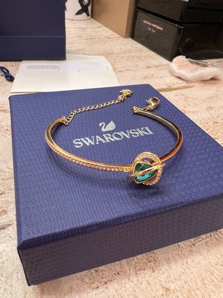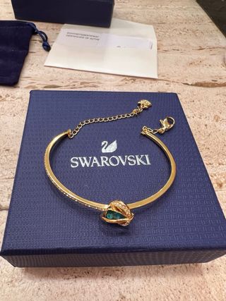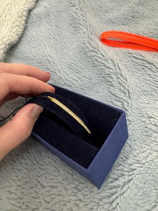 Elegante pulsera de la marca Swarovski. - Diseño curvo adornado con pequeños cristales. - Acabado en tono dorado. - Se le ha salido una parte de la pulsera, tocará repararla.