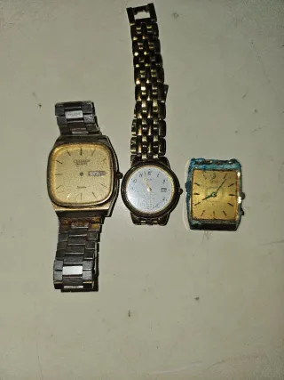 Conjunto de relojes de pulsera, ideales para piezas o reparación. REPARAR, EL CITIZEN DE LA IZQ LE FALTA LAS AGUJAS. Y EL SEIKO ESTA BASTANTE ROTO. NO DEVOLUCIONES - Un reloj Citizen con caja plateada y esfera blanca. - Un reloj Seiko con correa dorada y esfera blanca. - Un reloj cuadrado dorado con detalles azules en el bisel.