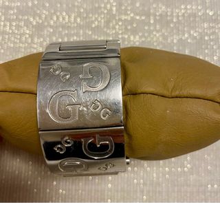 Elegante reloj Guess tipo pulsera con un diseño llamativo. - Pulsera metálica con grabado de G. - Bisel adornado con cristales brillantes. - Esfera plateada con Gs grabadas.