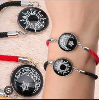 Conjunto de pulseras con diseños de sol y luna, ideales para compartir. - Diseño de sol con rayos detallados. - Diseño de luna creciente con estrella. - Cuerda trenzada resistente.