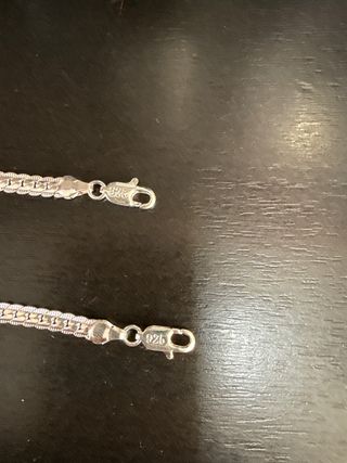 Conjunto de cadena y pulsera de plata. - Diseño de eslabones. - Cierre de mosquetón. Es un chapado de plata , no imanta , no se pone negro , estan nuevas , son 2 collares y 4 pulseras !! Ideal para regalar!