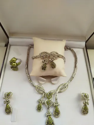 Elegante conjunto de bisutería con un diseño delicado y brillante. - Incluye collar, pulsera y pendientesy anillo - Detalles en forma de lazo y gotas. - Adornado con pequeñas piedras transparentes y detalles en verde.