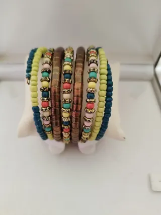 Conjunto de pulseras elásticas con un diseño vibrante y llamativo. - Cuentas de varios colores. - Elementos metálicos dorados. - Diseño tipo espiral.