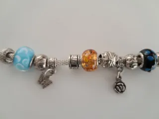 Pulsera estilo Pandora con varios abalorios. De 17cm. Con extensión de 4cm más en la cadena del cierre - Abalorios de cristal azul, naranja y azul claro con remolinos blancos. - Abalorio de cristal naranja con motas. - Charm de mariposa. - Charm de rosa. Regalo cordón dorado 16cm, para hacer otra del mismo estilo.