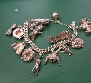 Pulsera de plata con diversos figuras de motivos españoles. - Peso: 96 gramos. - Diseño artesanal y cuidado con motivos de Toros, , Toreros Puerta de Alcala , Sagrada Familia , Cibeles,Neptuno ,Churros Pandereta,Guitarra, Sombrero Cotdobes - Cierre de mosquetón.