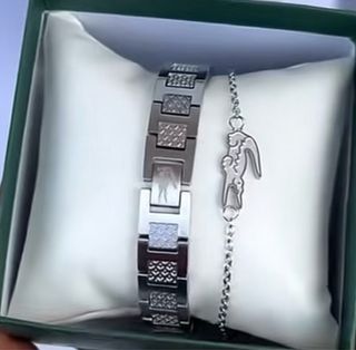 Conjunto de pulsera y brazalete de la marca Lacoste. - Diseño elegante en tono plateado. - Brazalete con eslabones y detalles texturizados. - Pulsera fina con charm. - Ideal para complementar tu estilo.