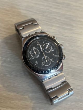 Reloj de pulsera Swatch Irony Chrono con esfera negra y detalles plateados. - Diseño deportivo y elegante. - Correa de metal. - Cronógrafo funcional.