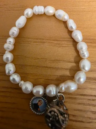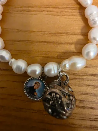 Pulsera de perlas con un charm de Santa Gema. - Perlas de forma irregular. - Charm con imagen de Santa Gema. - Detalle de otro charm metálico.