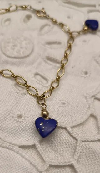 Elegante pulsera con dijes de corazón de lapislázuli y cadena de oro de 14 quilates. -contraste: 14K G F / C. D. - 4 piedras lapislazuli en forma de corazón. - Cadena de eslabones finos. - Cierre de mosquetón. - de 20 cm.