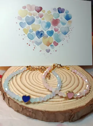 pulseras con dijes de corazón, perfectas para regalar. - Una pulsera tiene un dije de corazón azul. - La otra pulsera tiene un dije de corazón rosa. - Cuentas de cristal facetado en tonos pastel. Precio por unidad.